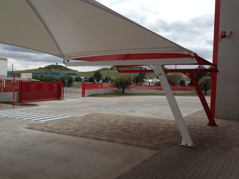 The assembly of the parking canopies with textile cover was realized in a group of simple places with our new model Europa Textil with rectangular tubular cover supports, made in the different colors chosen with the client and cantilevers lacquered in red and white.