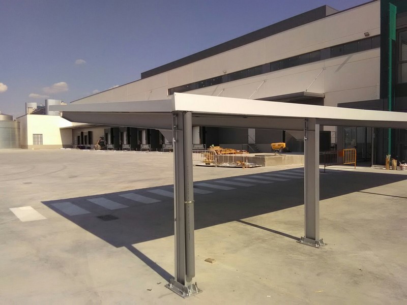 We have carried out the manufacture, design and assembly of a new project of car canopies for a processing centre in Rivas-Vaciamadrid, where the packaging and distribution of food products will take place. On this occasion, a total of 15 standard-size parking spaces have been installed, divided into two car canopies groups, one of them with single spaces and the other one with double spaces, so all its employers cars will be protected from sun and rain by the car canopies.