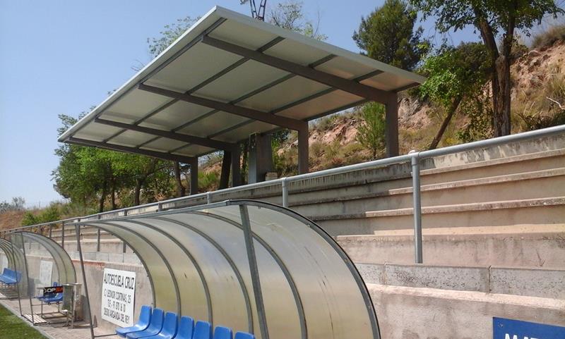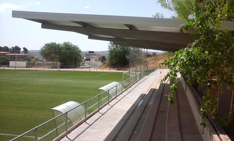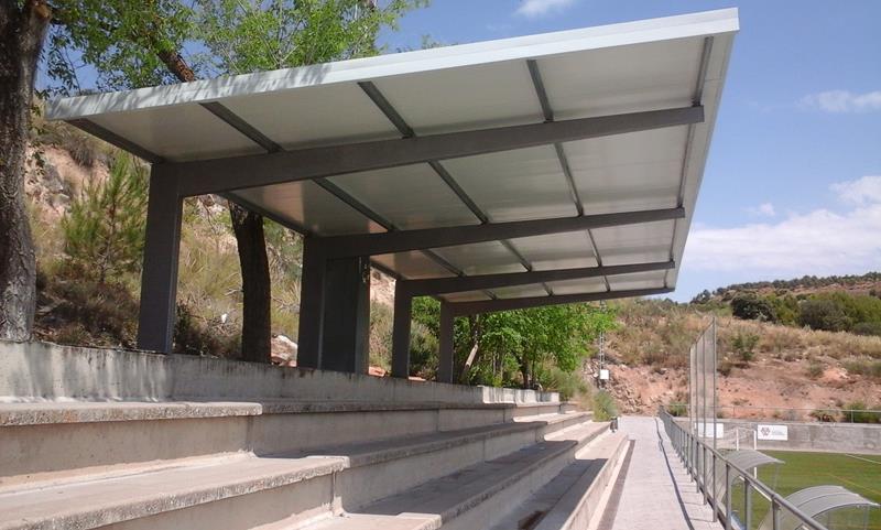 Our metallic shelters are generally used to realize parking shelters, but they also can have various uses. This time, we installed metallic shelters to cover the football stadium bleachers of Morata de Tajuña, located in the community of Madrid. Here are some photos of the work we have done.