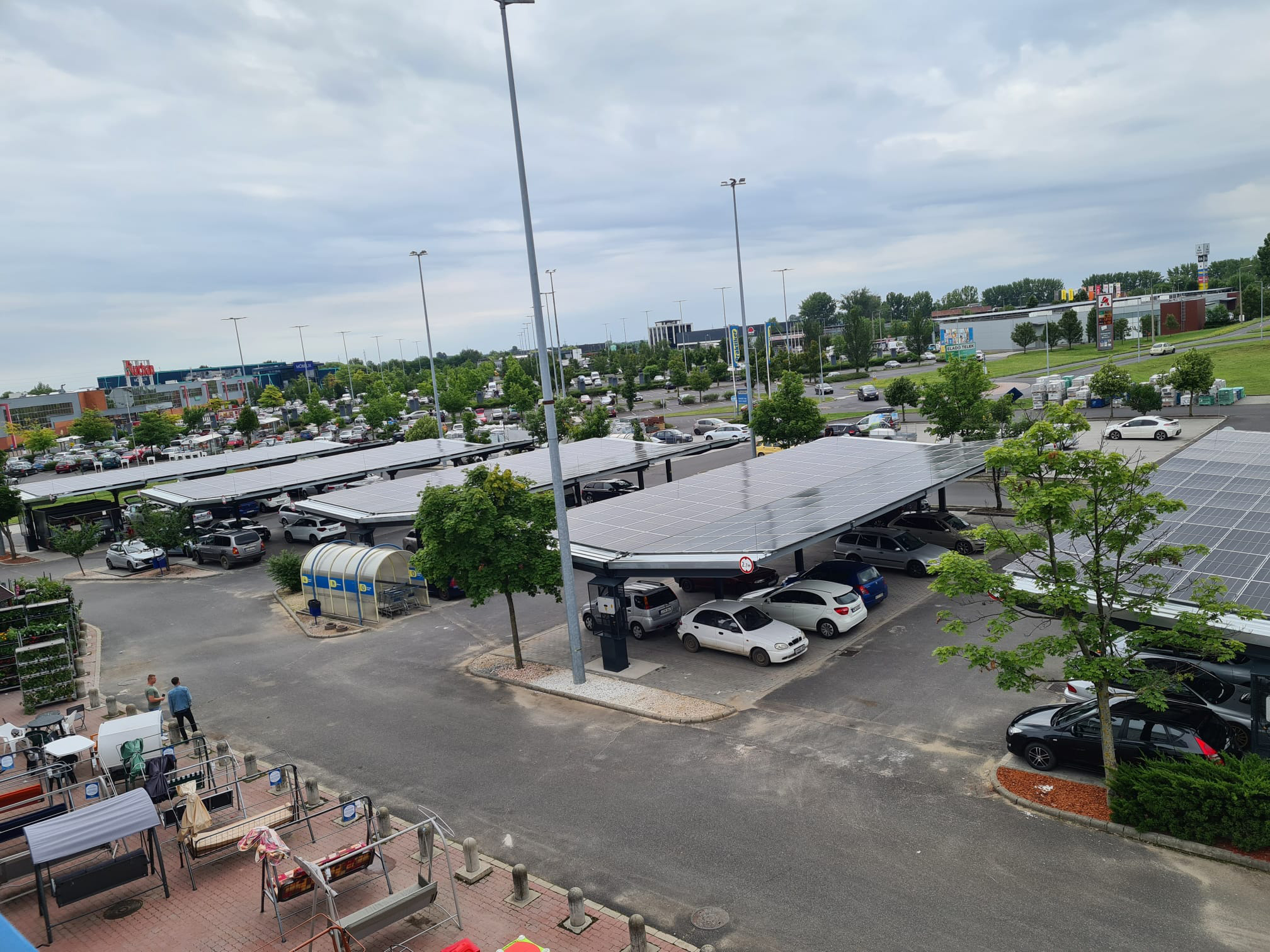 En Miskolc 86 marquesinas dobles SUNPARK 1 DOBLE Y distribuidas en 3 grupos de 18 plazas y 2 grupos de 16 plazas. La estructura en perfiles IPE, se terminó en gris antracita y para asegurar la estanqueidad de la marquesina va con cubierta en chapa trapezoidal galvanizada. Las correas, tipo C, son también galvanizadas.  Sobre la cubierta van instaladas placas fotovoltaicas para una potencia de 294,4 kWp cuya energía abastecerá las instalaciones del centro comercial de bricolaje, construcción, jardinería y decoración. A su vez las marquesinas servirán de plataforma comercial para la comercialización de instalaciones fotovoltaicas tanto para particulares como para empresas. En síntesis, es una respuesta de futuro a la demanda creciente en la UE por la energía limpia, respetuosa con el medioambiente sirviendo a su vez como medio de  refugio a los vehículos de los clientes contra las clemencias del tiempo. Las marquesinas también servirán de carga rápida para los vehículos eléctricos.