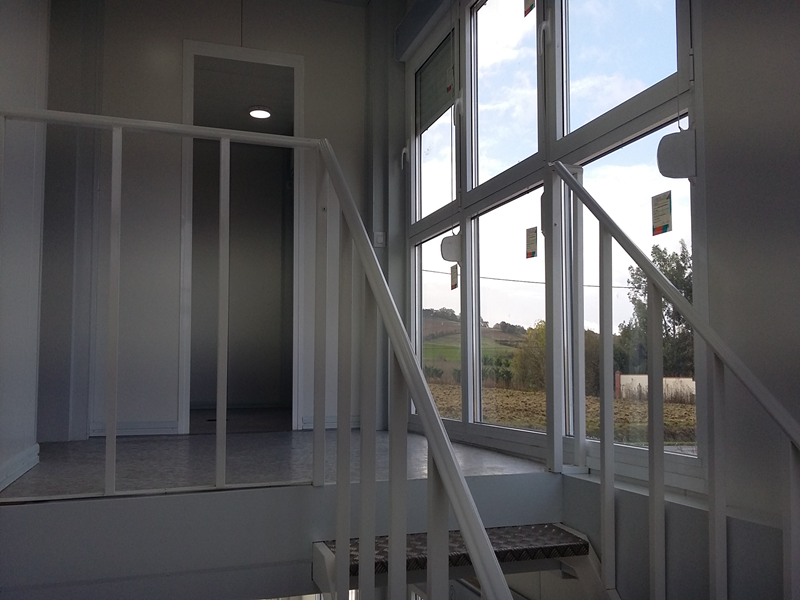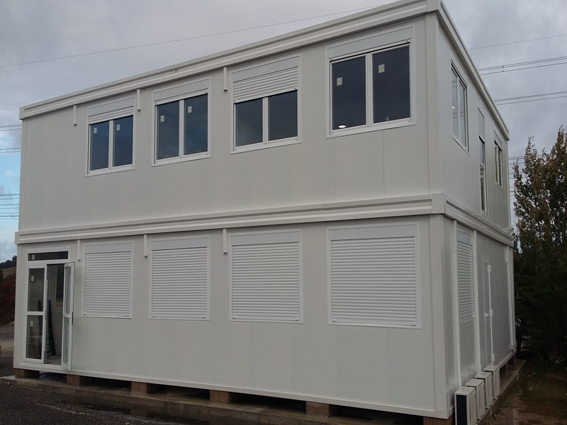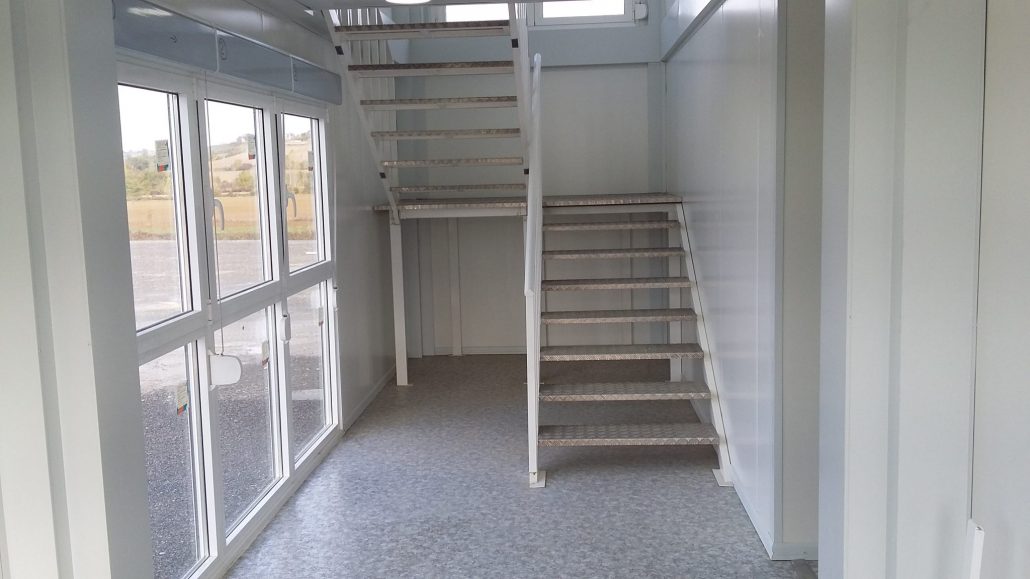 Il s’agit d’un bâtiment préfabriqué de bureaux modulaires de 300m², formé de 20 modules sur deux étages, avec un escalier d´accès intérieur.