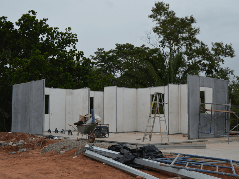Le montage a été réalisé par le personnel panaméen, supervisé par un architecte envoyé par Prefabri Steel pour collaborer et coordonner les travaux avec nos clients, qui ont déjà préparé les dalles de fondation avant l’arrivée des panneaux et  des éléments de construction industrialisé de Prefabri Steel.