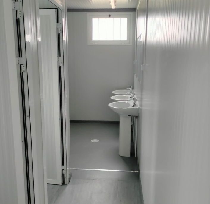 El espacio modular se entregó completo y listo para su uso, incluyendo termos de agua caliente de gran capacidad, extintores y luces de emergencia, accesorios para papel higiénico en los aseos, además de espejos, toalleros, cortinas de duchas y secamanos automáticos.
